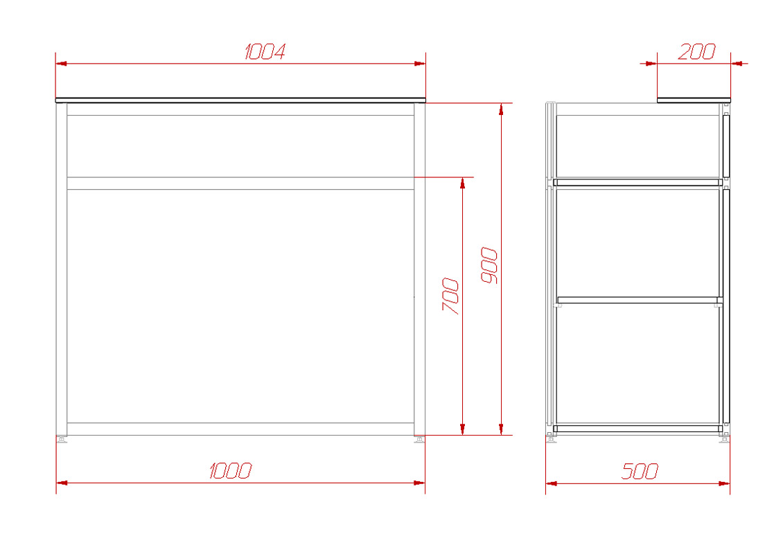 Габаритные размеры (ШхГхВ): 1000х500х900 мм Материалы: алюминиевый профиль, ДСП ламинированная. |